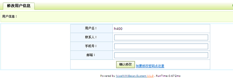 修改用户信息:进入该界面可以修改用户联系人,手机号码和邮箱等信息及修改用户名的密码